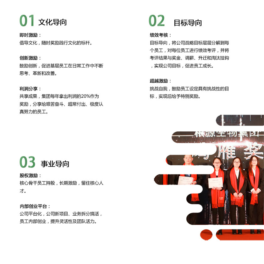 根源非常重視對(duì)員工的激勵(lì),通過多元化的激勵(lì)方式,營(yíng)造能夠激發(fā)員工創(chuàng)造力的環(huán)境和工作氛圍,建立員工自我更新、不斷突破的內(nèi)部競(jìng)爭(zhēng)機(jī)制,從而激發(fā)企業(yè)活力。